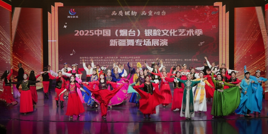 10月12日,由烟台开放大学、烟台融媒体中心联合主办的中国(烟台)银龄文化艺术季盛典在烟台电视台演播大厅开幕。烟台市委宣传部、教育局、民政局、烟台职业学院相关领导出席开幕式。来自北京、新疆、江苏等地的20支新疆舞代表队登台亮相,以灵动舞姿与浓郁风情带来精彩表演,为盛典注入鲜活活力。