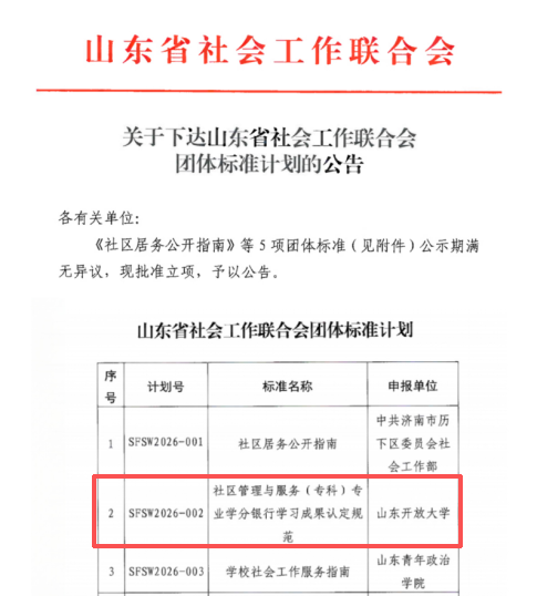 近日,山东省社会工作联合会发布《关于下达山东省社会工作联合会团体标准计划的公告》,我校教务处(学分银行管理中心、教学质量监控中心)副处长、教授于倩牵头申报的《社区管理与服务(专科)专业学分银行学习成果认定规范》成功获批立项。