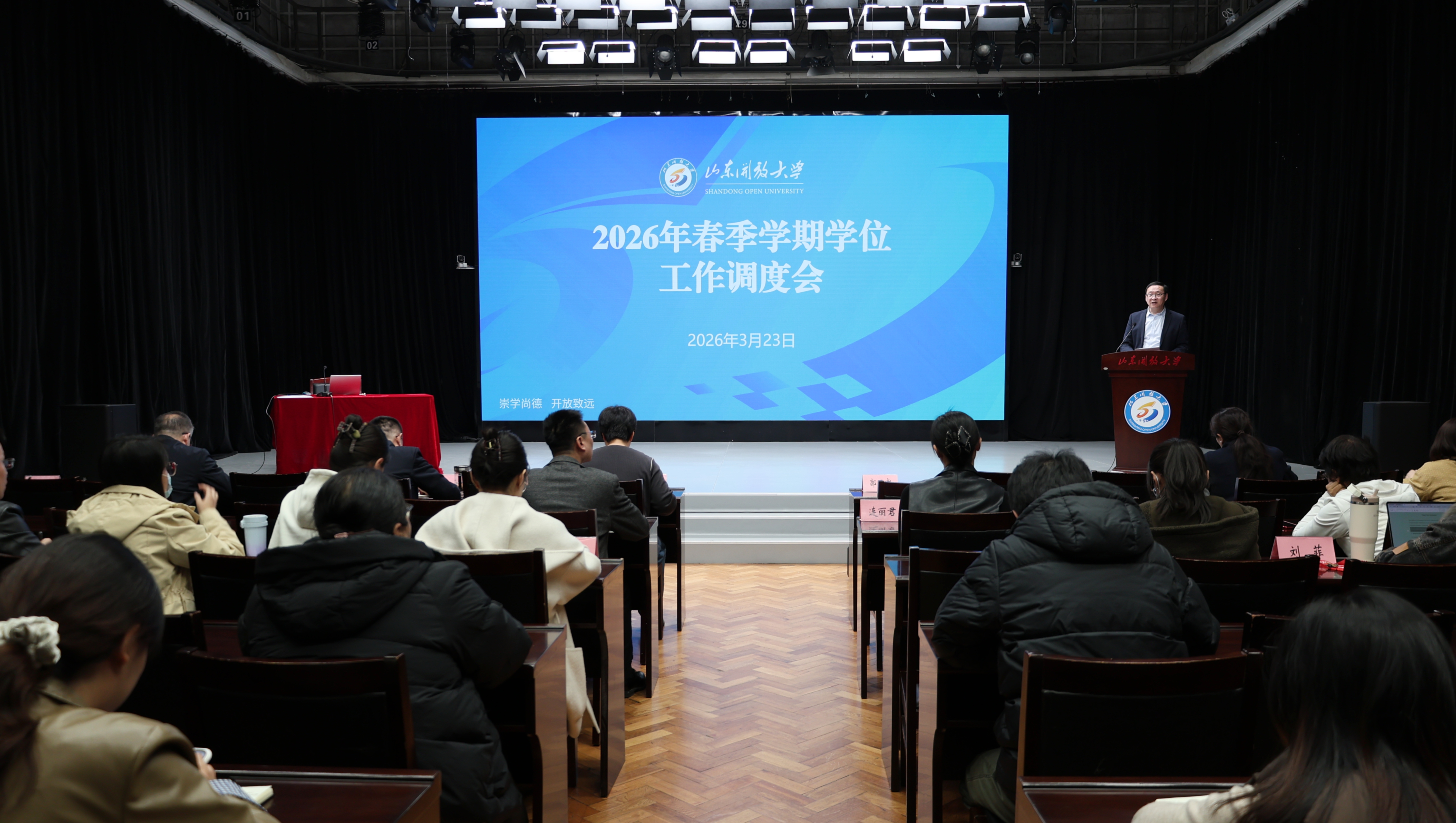 3月23日下午,学校在舜耕校区演播厅召开2026年春季学期学位工作调度会。学校党委委员、副校长郭丕宽出席会议并讲话。